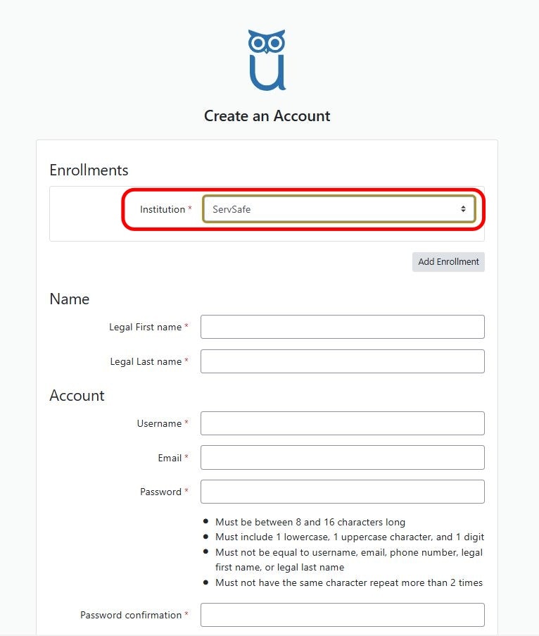 When asked to select an institution, choose ServSafe for the ServSafe