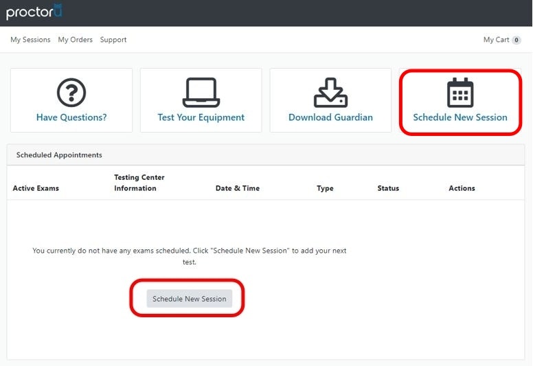 Log in to your ProctorU account and select Schedule New Session to begin scheduling your exam.