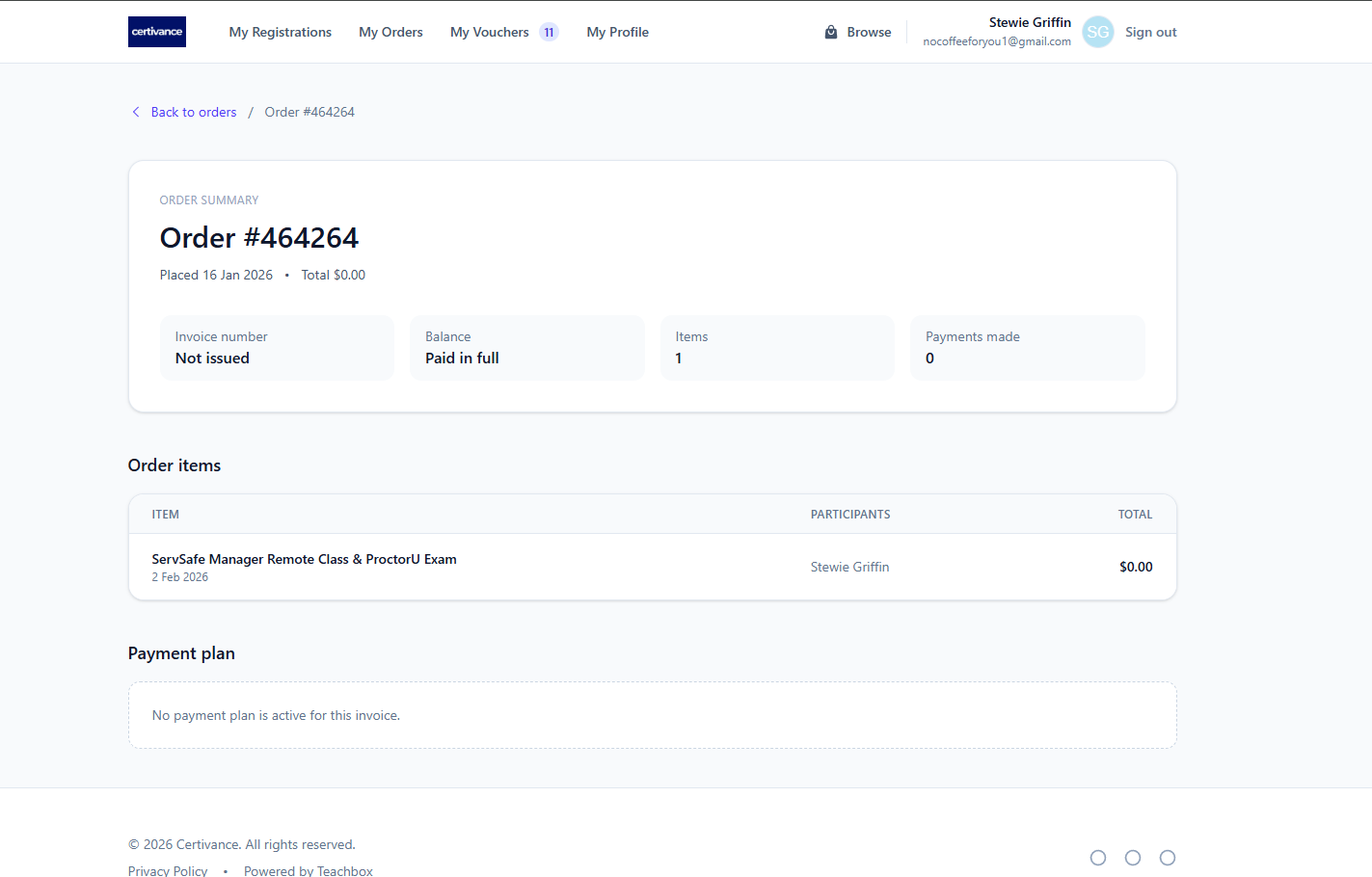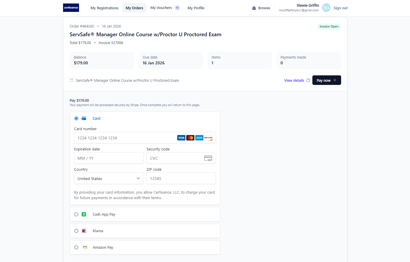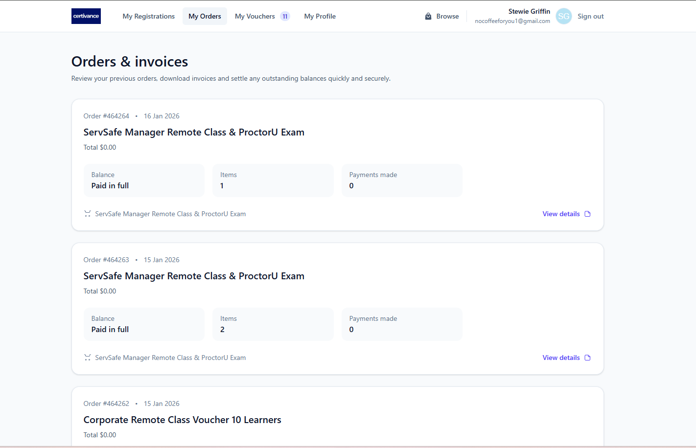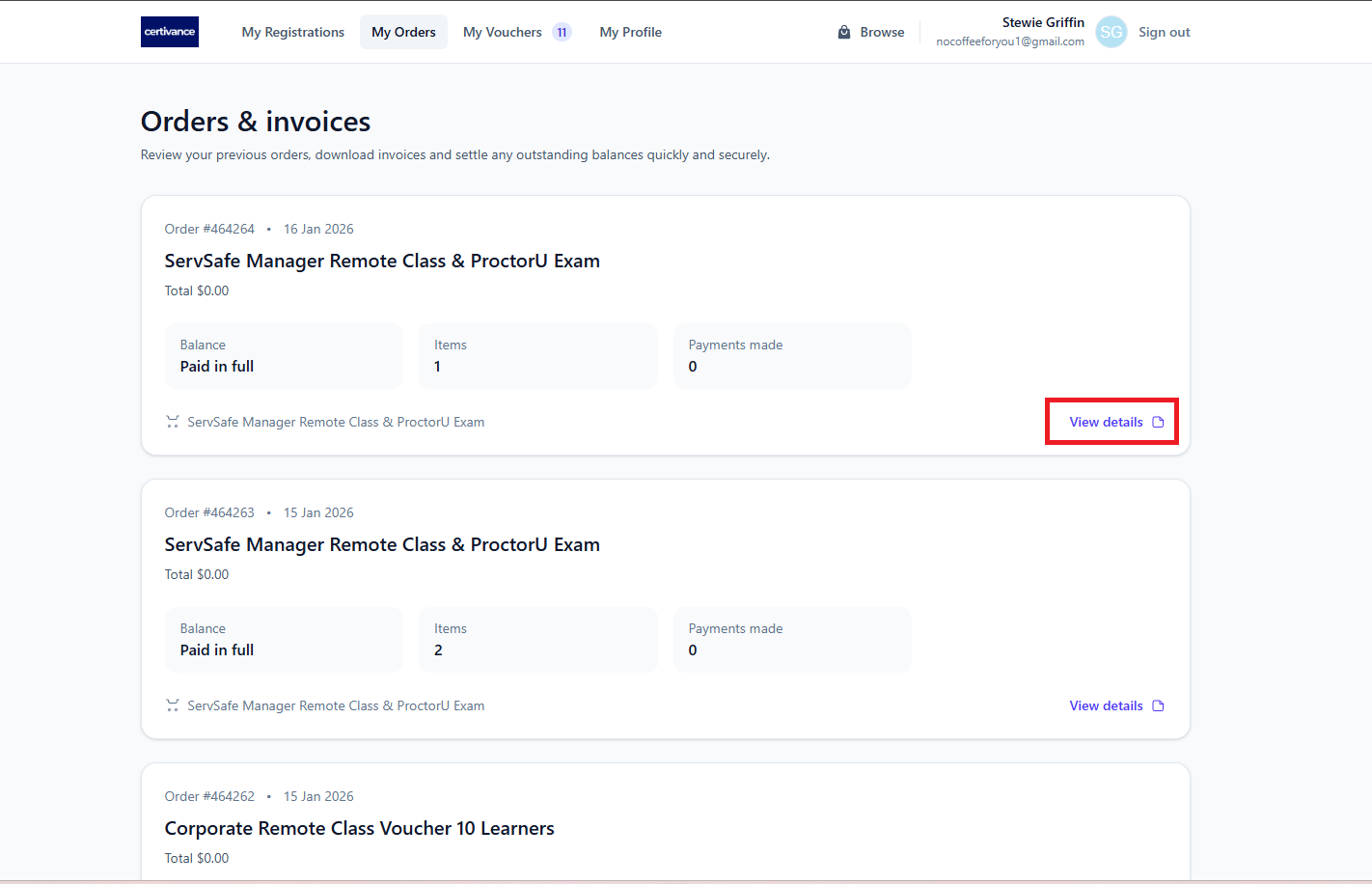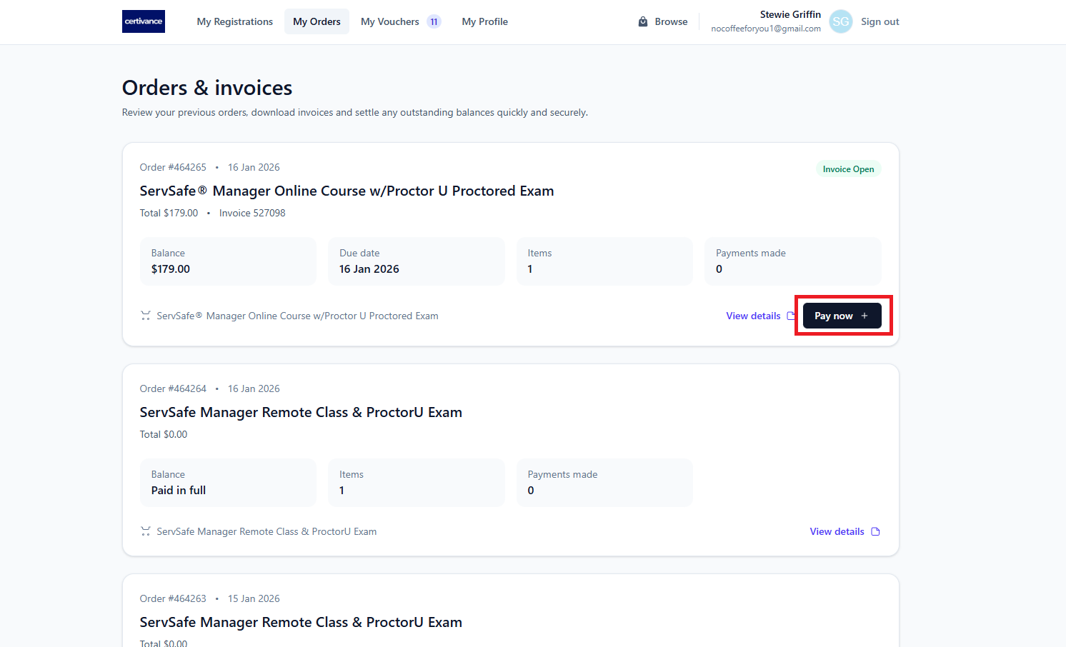 The My Orders tab shows all orders placed through Certivance and provides access to your invoices and payment options.