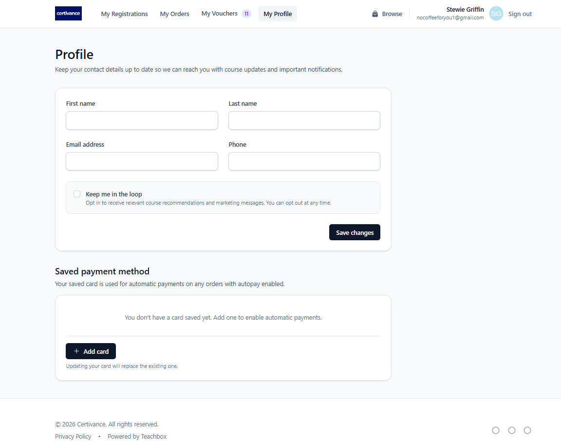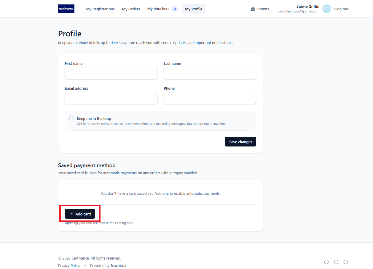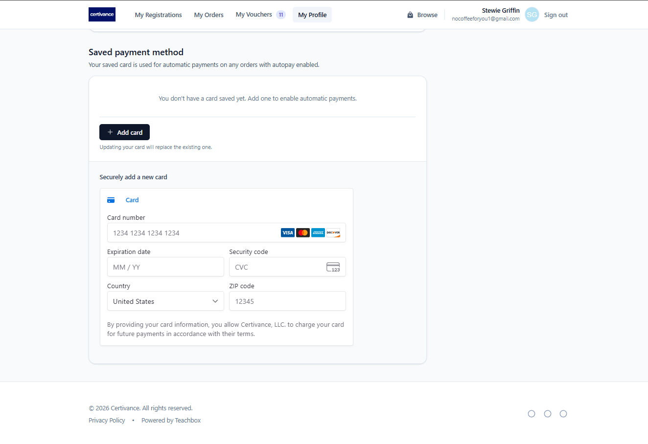 You can add a credit card to your profile for faster checkout and invoice payments.